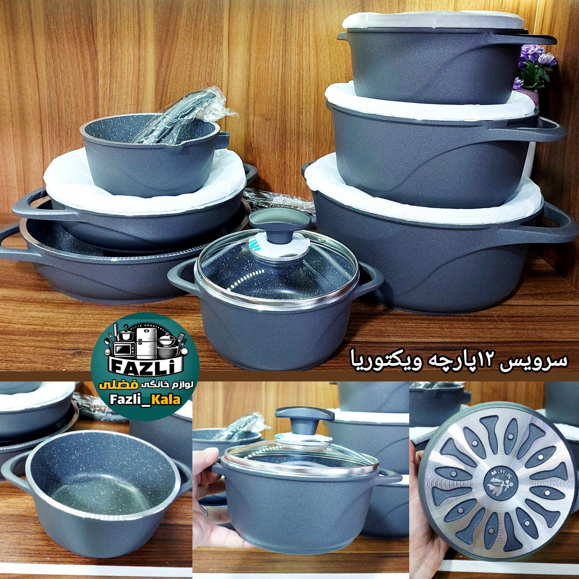 جنس: سرویس قابلمه ۱۲ پارچه چدن گرانیت (دایکست) طرح ویکتوریا از برند عروس