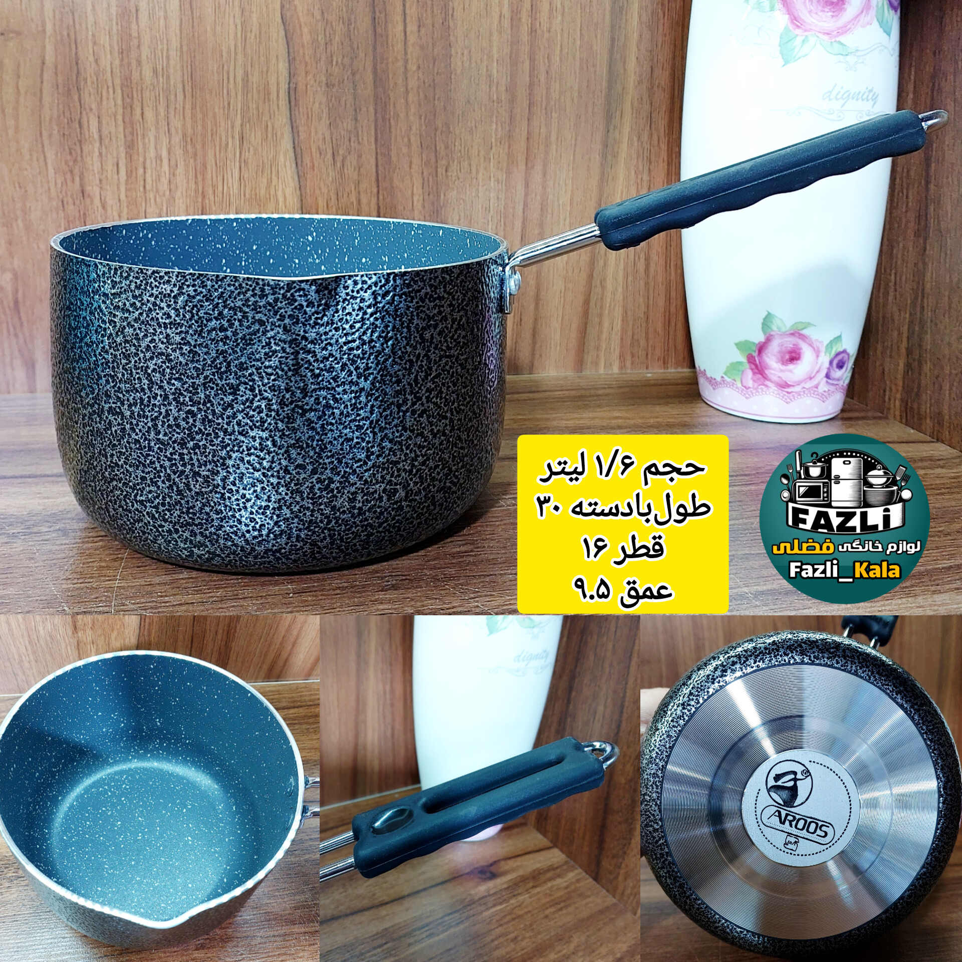 ابعاد: طول بادسته 30 قطر 16 عمق 9.5 حجم 1/6 لیتر